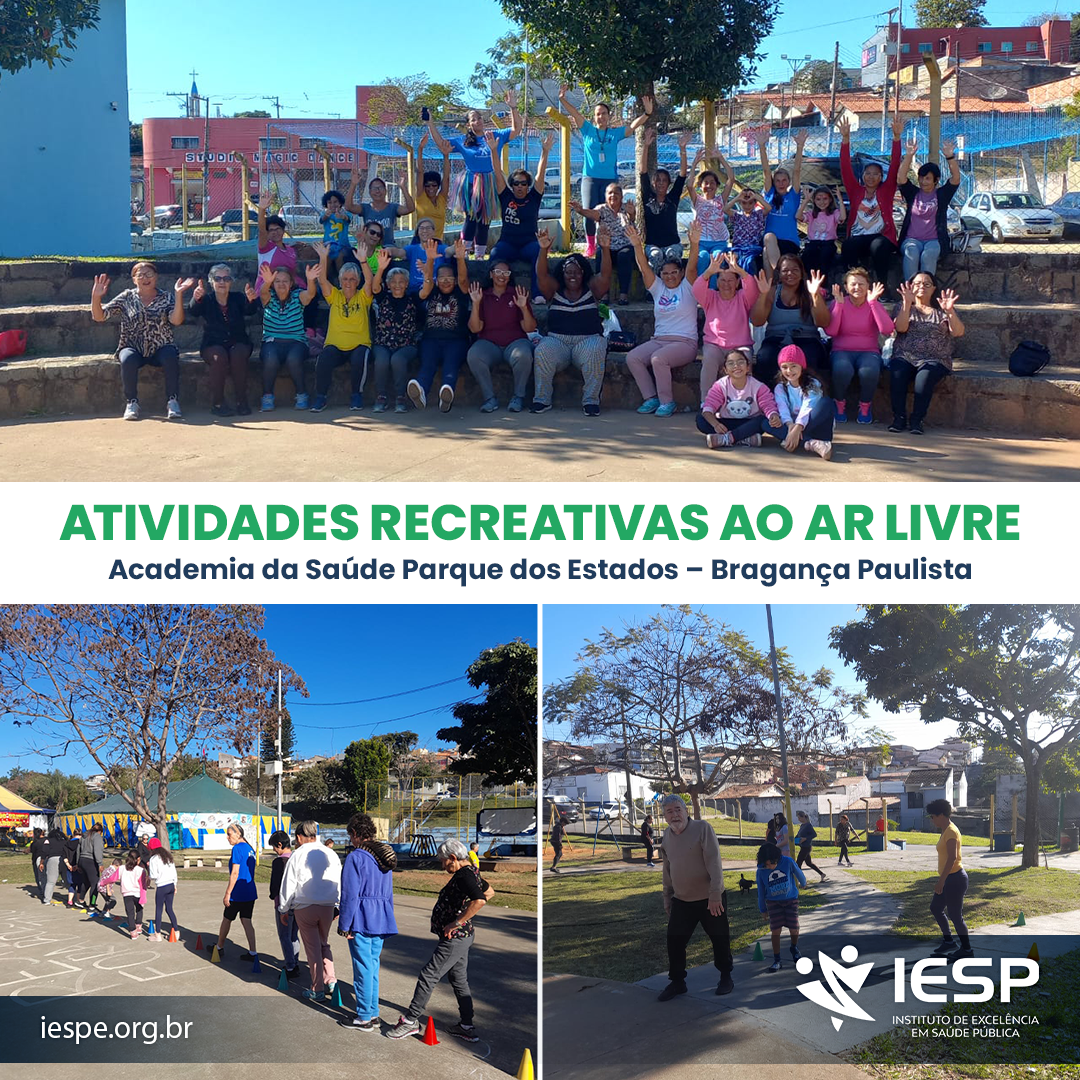 Na manhã da última sexta-feira (21), tivemos atividades de recreação que animaram homens, mulheres e crianças na Academia da Saúde Parque dos Estados, em Bragança Paulista.A ação teve como objetivo promover a saúde de maneira divertida através de exercícios, alongamentos, circuito funcional, atividades lúdicas, musicaterapia, pintura de rosto, estafetas e muito mais. Tais atividades trabalham