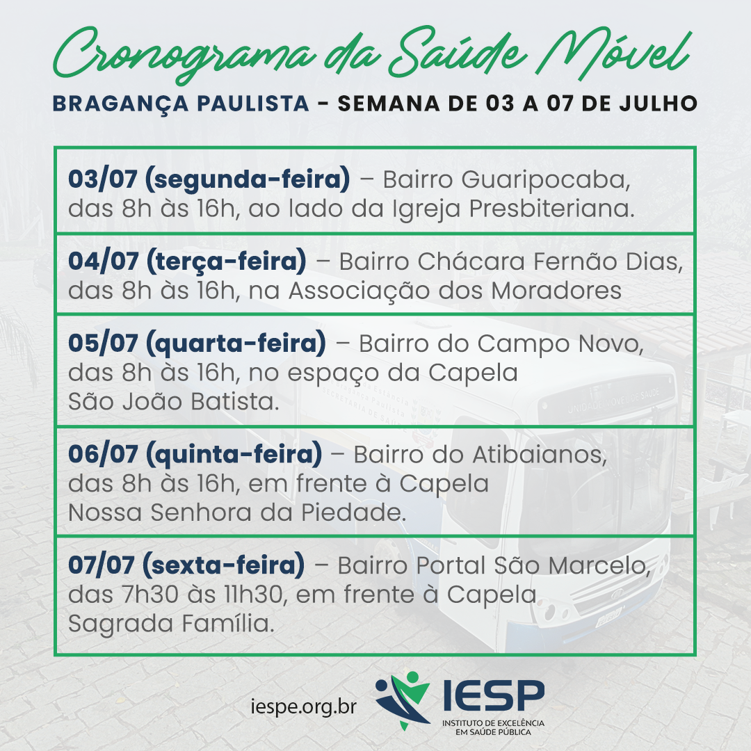 Neste mês de julho, a unidade móvel de saúde municipal, sob gestão do IESP, atenderá onde há maior demanda, levando cuidados de saúde e qualidade de vida à população de Bragança Paulista.